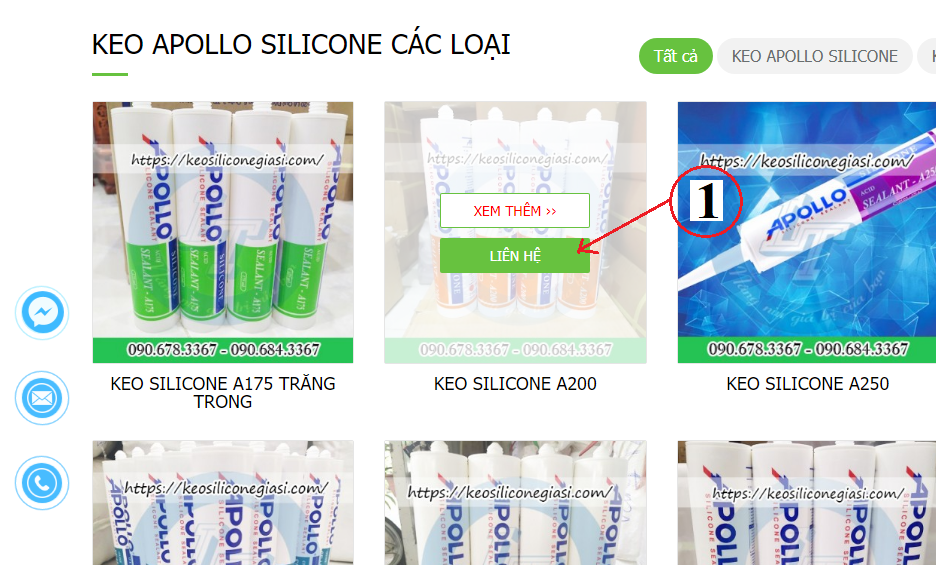 - Qúy khách truy cập vào website: keosiliconegiasi.com bên ngoài trang chủ có hiển thị những sản phẩm công ty đang bán, sau đó bấm vào bât kì sản phẩm nào quý khách cần mua sẽ hiể thị như hình bên dưới quý khách bấm vào chữ liên hệ có đánh số 1 bên dưới hình