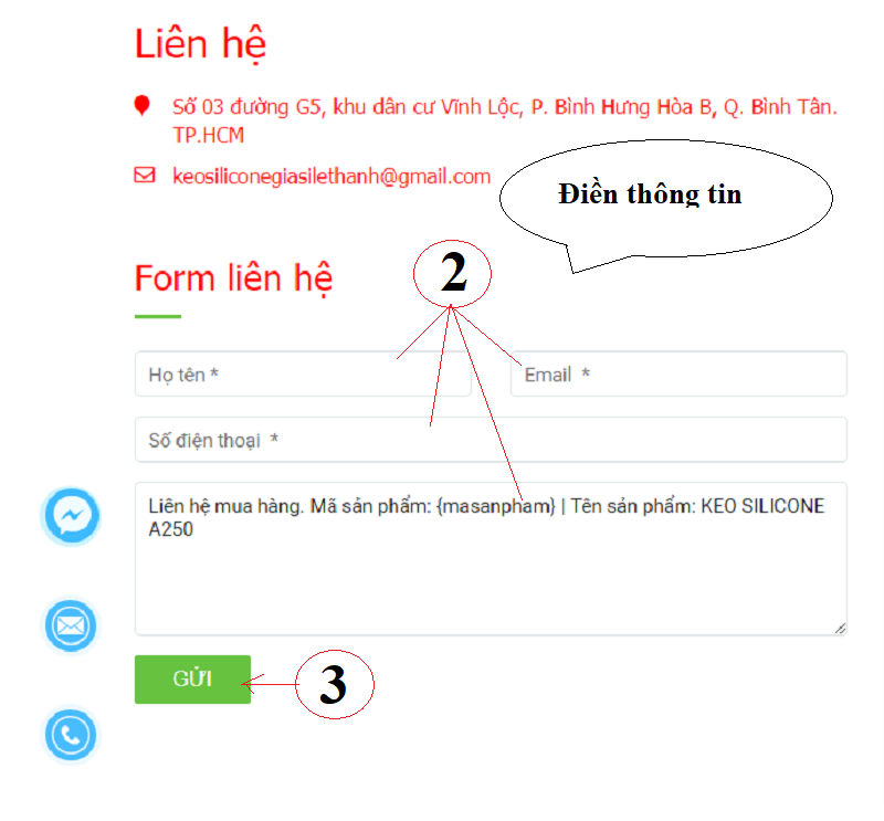 - Sau khi quý khách bấm vào chữ liên hệ trên sản phẩm trong phần trang chủ quý khách sẽ điềm đầy đủ vào form liên hệ như hình bên dưới có đánh số 2 . Tiếp theo đó bấm vào gửi có đánh số 3 như hình bên dưới