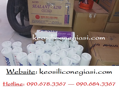 Keo Apollo A250: là chất trám trét dạng axit một thành phần với khả năng đàn hồi rất cao. Sản phẩm này có khả năng chống chịu được độ ẩm Ozone cũng như tia cực tím. Quý khách sẽ không phải lo lắng keo sẽ bị mất màu hay rạn nứt trong khi sử dụng ngoài trời. Ngoài ra, nếu được xử lý thêm một lớp sơn lót thích hợp, sản phẩm này có thể kết dính với hầu hết các loại nguyên vật liệu xây dựng, bể cá kính.